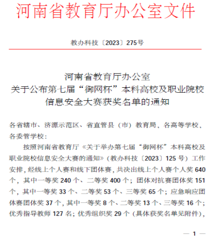 近日,河南省教育厅办公室下发了文件《关于公布第七届“御网杯”本科高校及职业院校信息安全大赛获奖名单的通知》(教办科技〔2023〕275号),公司学子再获佳绩,取得多项奖励,其中线上个人挑战赛一等奖12项,线下团体对抗赛一等奖1项、二等奖2项,线下应急响应团体赛三等奖1项,李学威、王晓菲、黄宇达三位老师被评为优秀指导教师。