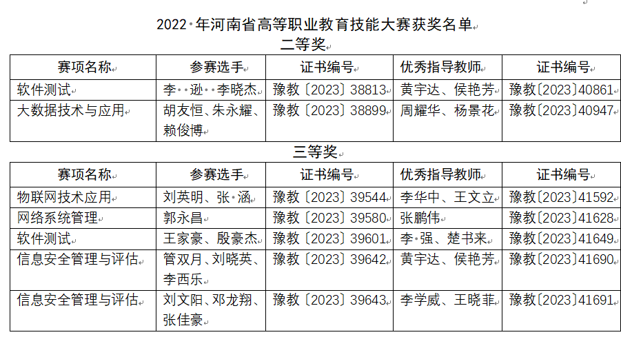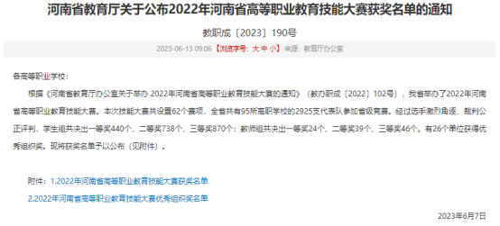 近日,河南省教育厅办公室下发了文件《关于公布2022年河南省高等职业教育技能大赛获奖名单的通知》(教职成〔2023〕190号),公司学子经过指导教师的悉心指导,积极备战、认真参赛、激烈比拼,再获佳绩,共获得二等奖2项、三等奖5项,获奖数量和质量再创新高。